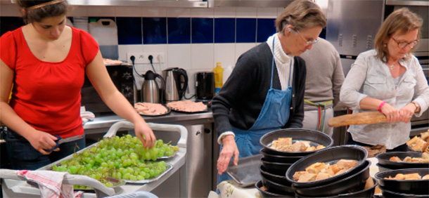 Une équipe de bénévoles prépare tous les mercredis soirs un repas chaud pour plus de 100 personnes qui se trouvent isolées soit parce qu’elles vivent dans la rue, soit parce qu’elles cherchent un peu de chaleur et d’amitié. Il s’agit d’un moment de rencontres, d’écoute, de partage, et de prière.